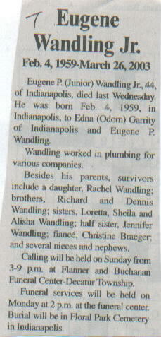 | Survived By | Parents, Edna (Odom) Garrity of Indianapolis and Eugene P. Wandling; daughter, Rachel Wandling; brothers, Richard and Dennis Wandling; sisters, Loretta, Sheila, and Alisha Wandling; half sister, Jennifer Wandling; fiancee, Christine Braeger; several nieces and nephews. |