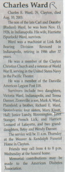 | Other | The son of the late Carl and Dorothy (Rudicel) Ward, he was born in Indianapolis. Veteran of WW II, serving in the US Navy in the Pacific Theater. |