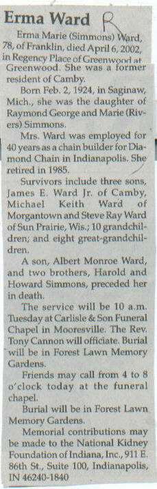 Other A son, Albert Monroe Ward, and two brothers, Harold and Howard Simmons, preceded her in death.