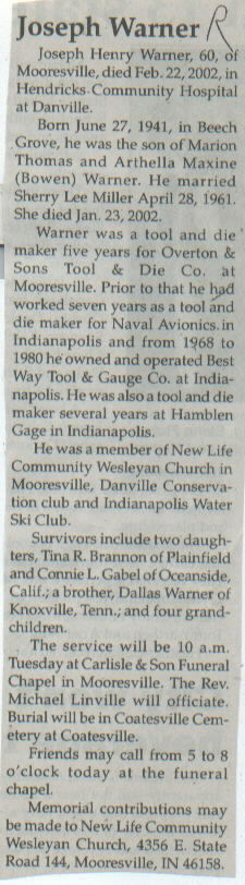 | Survived By | Two daughters, Tina R. Brannon and Connie L. Gabel; brother, Dallas Warner; 4 grandchildren. |