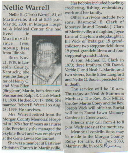 | Survived By | Spouse, Robert E. Warrell; 2 sons, Raymond E. and Donald J. Clark; daughter, Joyce Lane; stepdaughter, Jill Wick; 15 grandchildren; 2 stepgrandchildren; 19 great-grandchildren; 4 stepgreat-grandchildren. |