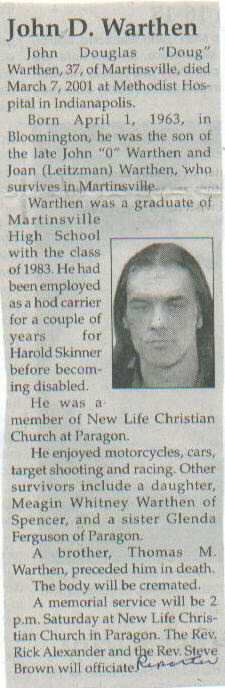| Other | Born in Bloomington, he was the son of the late John "O" Warthen and Joan (Leitzman) Warthen, who survives in Martinsville. A brother, Thomas M. Warthen, preceded him in death. The body will be cremated. |