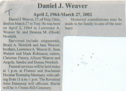 | Survived By | Parents, Lawrence A. Weaver, Sr. and Deanna M. (Hook) Newkirk; stepparents, Bruce A. Newkirk and Jane Weaver; brothers, Lawrence A. Weaver, Jr., Sean Watson, and Mark Robinson; sisters, Christine Finney, Allison Weaver, and Angela, Sandra, and Donna Newkirk. |