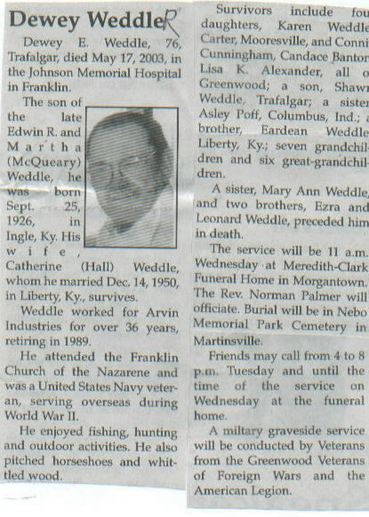 | Other | The son of the late Edwin R. and Martha (McQuearay) Weddle, he was born in Ingle, Ky. U.S. Navy veteran, serving overseas during WW II. |