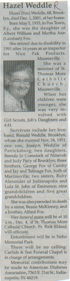 | Survived By | Spouse; son, Joseph Weddle; 2 daughters, Brenda Jo Comstock and Judy Fiely; 3 brothers, George, Jay, and Talmage Fox; 2 sisters, Ruby Alexander and Lula St. John; 9 grandchildren; 5 great-grandchildren. |