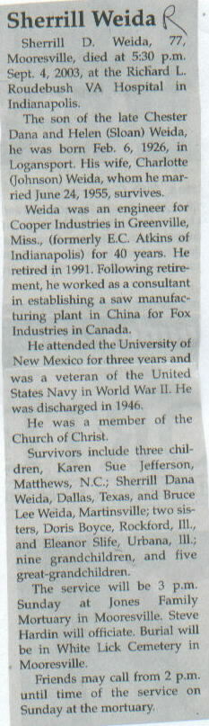 | Other | The son of the late Chester Dana and Helen (Sloan) Weida, he was born in Logansport. Veteran of the US Navy in WW II; discharged in 1946. |