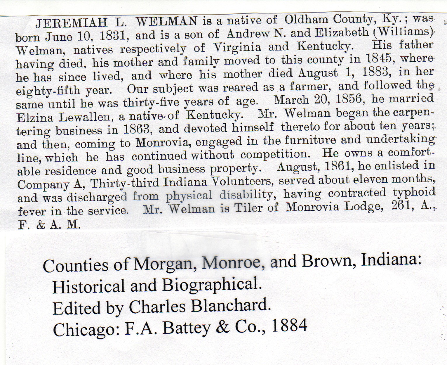 | Other | Born in Oldham Co., Ky. Parents: Andrew N. and Elizabeth (Williams) Welman. Father died young, and then mother and family moved to Morgan Co., Indiana in 1845. Civil War veteran: Co. A, 33rd Ind. Married on March 20, 1856 in Morgan Co. |