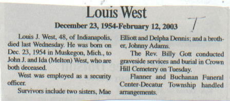 | Other | Born in Muskegon, Mich., to John J. and Ida (Melton) West, who are both deceased. |
