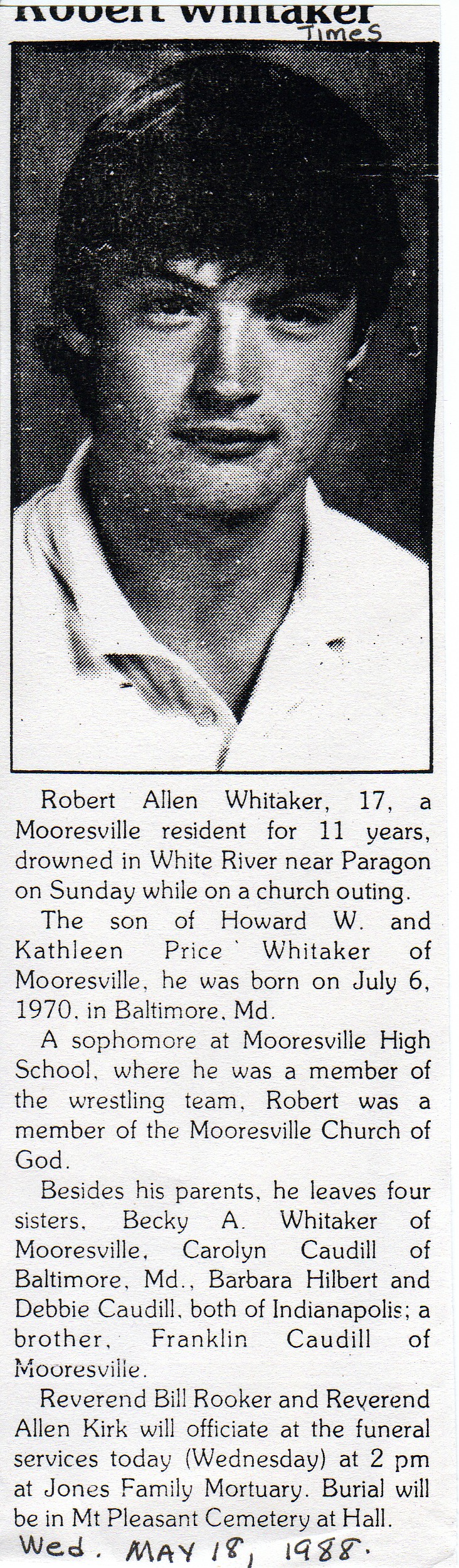 | Other | Age 17. Jones Mortuary (Rev. Bill Rooker and Rev. Allen Kirk officiating.) Buried Mt. Pleasant cemetery at Hall. Drowned in White River near Paragon while on church outing. Sophomore at Mooresville HS; on wrestling team. |