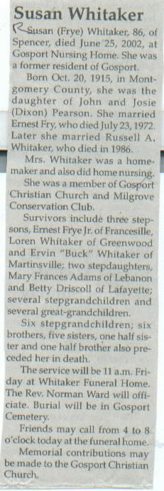 | Survived By | Three stepsons, Ernest Frye, Jr., Loren Whitaker, and Ervin "Buck" Whitaker; 2 stepdaughters, Mary Frances Adams and Betty Driscoll; several stepgrandchildren; several great-grandchildren. |