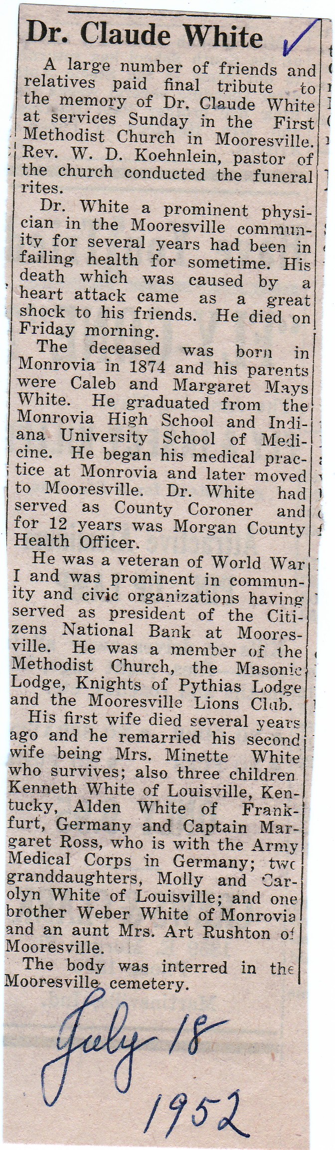Other Age 78. Born in Monrovia, Morgan Co., Ind.; son of Caleb Frank and Margaret C. Mays White. Carlisle funeral at Methodist Church (Rev. W.D. Koehnlein.) Buried Mooresville Cemetery. Practiced medicine for over 51 years. County health officer, coroner, President of Citizens Bank, Mason, K of P, and civic clubs. Veteran of World War I; Capt. 84th Div. Field Hospital.