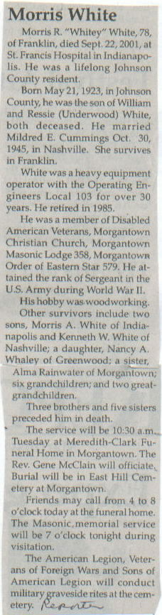 | Other | Born in Johnson County, he was the son of William and Ressie (Underwood) White, both deceased. He attained the rank of Sergeant in the U.S. Army during WW II. |