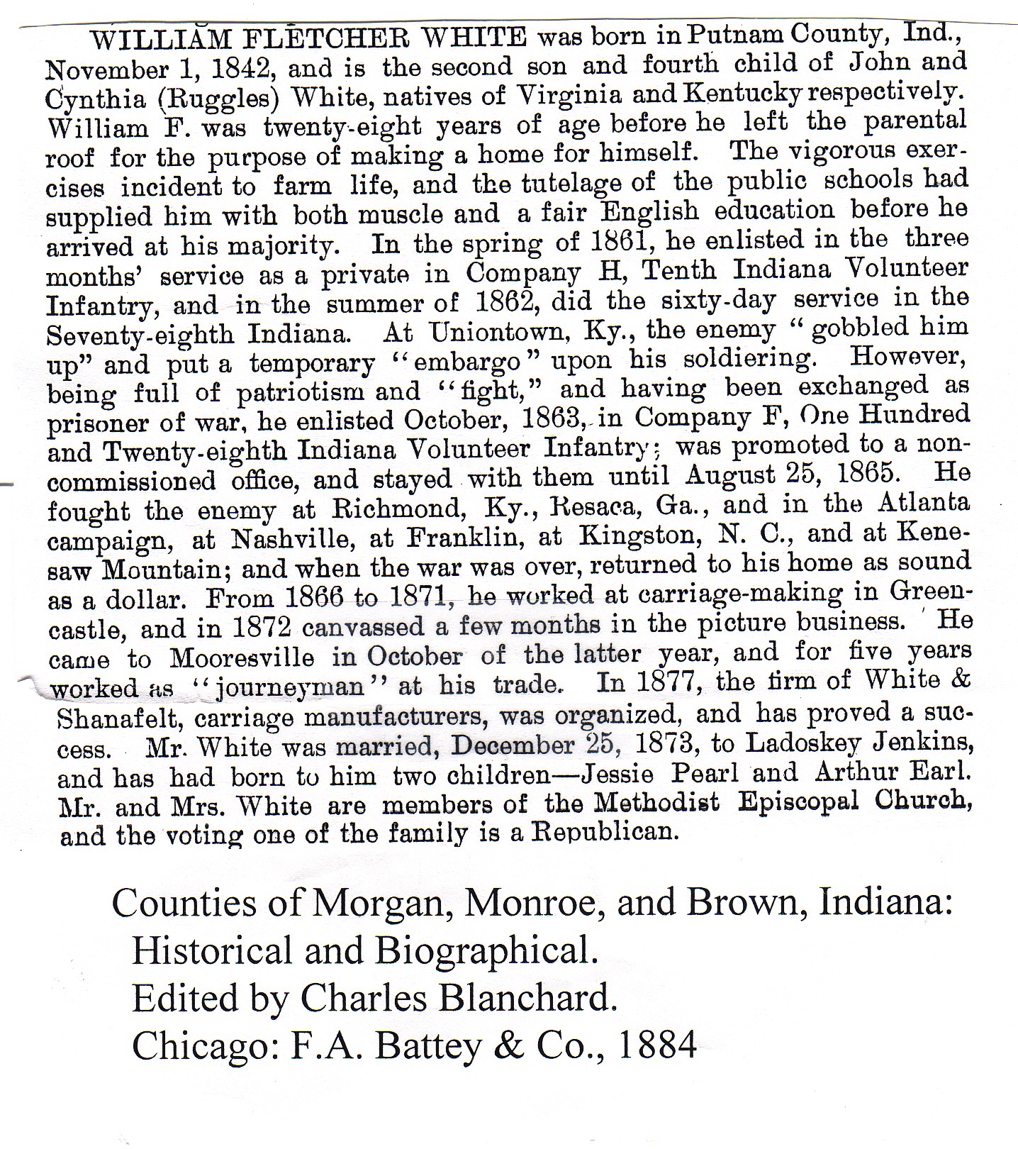 | Other | Age nearly 86. Born in Putnam Co., Ind. Parents: John and Cynthia (Ruggles) White. Married Ladosea/Ladoskey Jenkins in 1873. Veteran of the Civil War; Company F, 123rd Ind. Volunteers. Came to Mooresville in 1872. Funeral at Methodist Church. Buried in White family plot, Mooresville cemetery. |