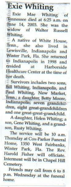 | Survived By | Two sons, Bill and Paul Whiting; daughter, Betty Moore; 7 grandchildren; 8 great-grandchildren; one great-great-grandchild. |
