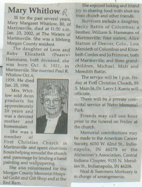 | Survived By | Daughter, Becky Battin; brother, William S. Hammans; 4 sisters, Alice Statton, Lois Merideth, Elizabeth Cordes, and Jo Primmer; 3 grandchildren, Michael, Matt, and Meredith Battin. |