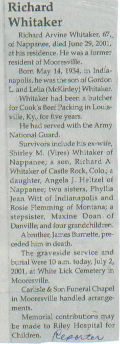 Survived By Ex-wife, Shirley M. (Vires) Whittaker; son, Richard A. Whittaker; daughter, Angela J. Heltzel; 2 sisters, Phyllis Jean Witt and Rosie Flemming; stepsister, Maxine Doan; 4 grandchildren.