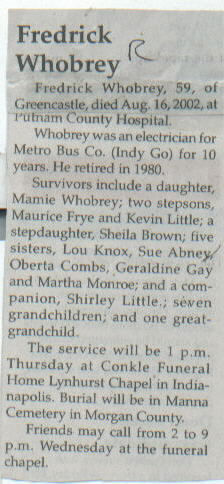 | Survived By | Daughter, Mamie Whobrey; 2 stepsons, Maurice Frye and Kevin Little; stepdaughter, Sheila Brown; 5 sisters, Lou Knox, Sue Abney, Oberta Combs, Geraldine Gay, and Martha Monroe; companion, Shirley Little; 7 grandchildren; one great-grandchild. |