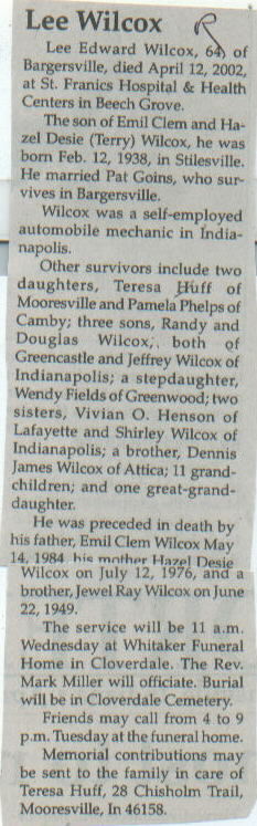 | Survived By | Widow; 2 daughters, Teresa Huff and Pamela Phelps; 3 sons, Randy, Douglas, and Jeffrey Wilcox; stepdaughter, Wendy Fields; 2 sisters, Vivian O. Henson and Shirley Wilcox; brother, Dennis James Wilcox; 11 grandchildren; one great-granddaughter. |