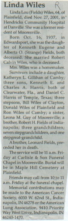 | Other | Born in Edwardsport, she was the daguhter of Kenneth Eugene and Alberta O. (Strange) Fields, both deceased. |
