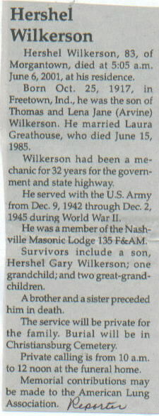 | Other | Born in Freetown, Ind., he was the son of Thomas and Lena Jane (Arvine) Wilkerson. He served with the U.S. Army from Dec. 9, 1942 through Dec. 2, 1945, during WW II. |