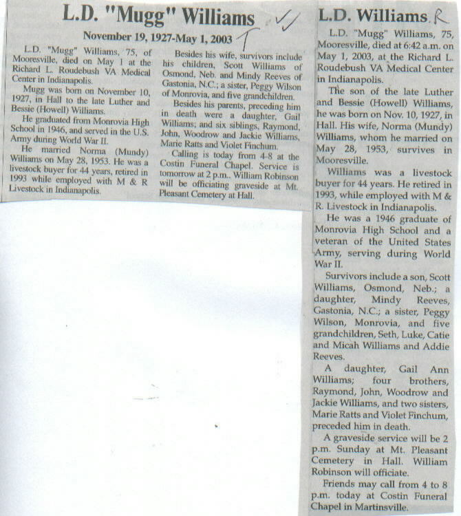 | Other | Born to the late Luther and Bessie (Howell) Williams. Served in the U.S. Army during WW II. Preceded in death by a daughter, Gail Williams, and six siblings, Raymond, John, Woodrow and Jackie Williams, Marie Ratts, and Violet Finchum. |