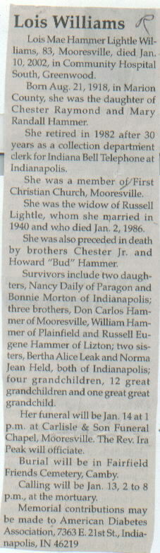 | Survived By | Two daughters, Nancy Daily and Bonnie Morton; 3 brothers, Don Carlos, William, and Russell Eugene Hammer; 2 sisters, Bertha Alice Leak and Norma Jean Held; 4 grandchildren; 12 great-grandchildren; one great-great-grandchild. |