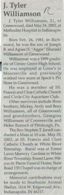| Survived By | Parents, Joseph R. and Agnes H. "Aggie" (Sluciak) Williamson; 3 brothers, Mickey, Andy, and Beau Williamson; grandmothers, Georgina Williamson and Helen Buresch. |