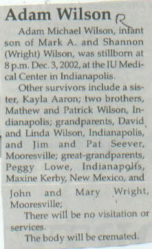 | Survived By | Parents, Mark A. and Shannon (Wright) Wilson; sister, Kayla Aaron; 2 brothers, Matthew and Patrick Wilson; grandparents, David and Linda Wilson, Jim and Pat Seever; great-grandparents, Peggy Lowe, Maxine Kerby, and John and Mary Wright. |