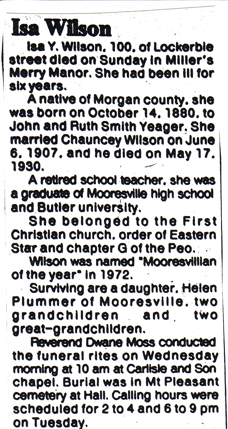 | Other | Age 100. Carlisle funeral (Rev. Duane Moss officiating.) Buried Mt. Pleasant cemetery at Hall. Parents: John and Ruth Smith Yeager. Retired school teacher. Graduate Mooresville HS and Butler U. Mooresvillian of the Year, 1972. |
