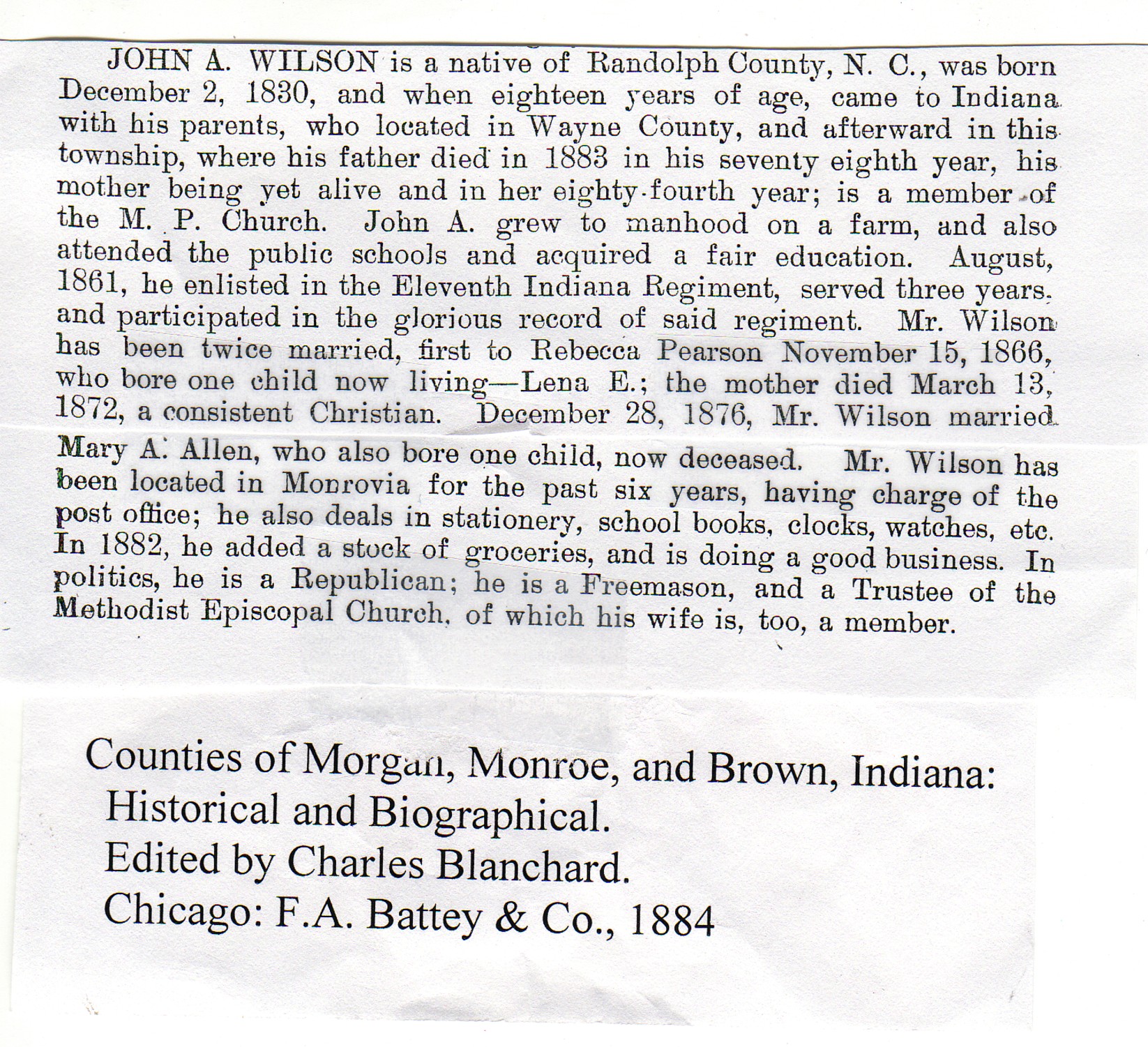 | Other | Age 94. Born in Randolph Co., N.C. Civil War veteran: Co. H, 11th Reg. Ind. Vet. Vol. Inf. Married first wife on Nov. 15, 1866; they had one child still living -- Lena E. Wife died March 13, 1872. Married second wife on Dec. 28, 1876; they had one child, now deceased. Mary died in 1917. |