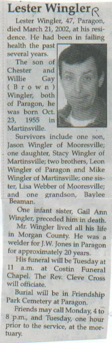 | Survived By | Parents, Chester and Willie Gay (Brown) Wingler; son, Jason Wingler; daughter, Stacy Wingler; 2 brothers, Leon and Mike Wingler; sister, Lisa Webber; grandson, Baylee Beaman. |