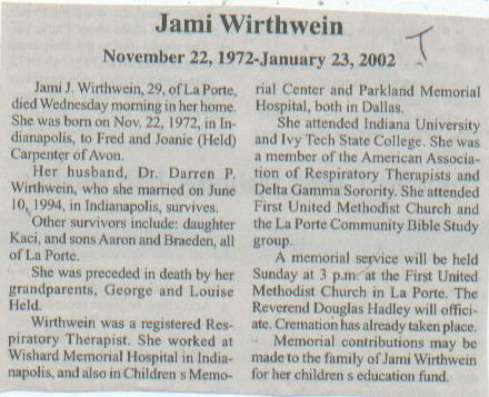 | Survived By | Spouse; parents, Fred and Joanie (Held) Carpenter; daughter, Kaci Wirthwein; sons, Aaron and Braeden Wirthwein. |