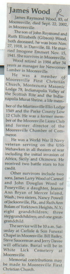 Survived By Widow; 2 sons, James Larry and John Douglas Wood; daughter, Jeanne Ann Bryan; 2 sisters, Nancy Powell and Ruth Ann Bolam; 8 grandchildren; 3 stepgrandchildren; one great-grandchild.