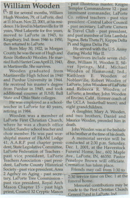Survived By Widow; 6 children, William H. Wooden II, Michael Wooden, Kathleen E. Wooden, Robert Wooden, John Wooden, and Rebecca R. Wooden; brother, John Wooden (former coach of the UCLA basketball team); 8 grandchildren.