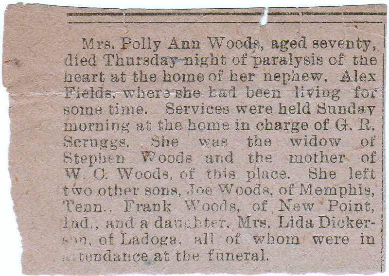 Other Age 70 years and 1 month. Funeral at the home, G. R. Scruggs officiating. Died at the home of her nephew, Alexander Fields, unexpectedly.