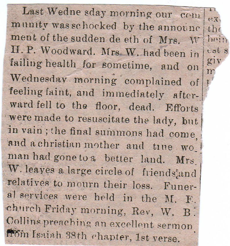 | Other | Age 63. Born in Orange Co., N.C. Family came to Indiana in 1847, settling in Monroe Twp., Morgan Co. Married W.H.P. Woodward on Aug. 24, 1858. |