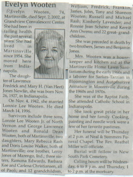 | Survived By | Three sons, Lonnie Lee, Jr., George Lawrence, and Ronald Dean Wooten; 2 daughters, Mary Rebecca Rash and Doris Louise Walker; brother, Leroy Jones; 3 sisters, Ramona Edwards, Barbara Kee, and Carlena Christiansen; 12 grandchildren, William, Fredrick, Franklin, James, John, Tony, and Shannon Wooten, Russell and Michael Rash, Kimberly Lavender, Ronnie Jean Scherer, and Kerrie Ann Owens; 22 great-grandchildren. |