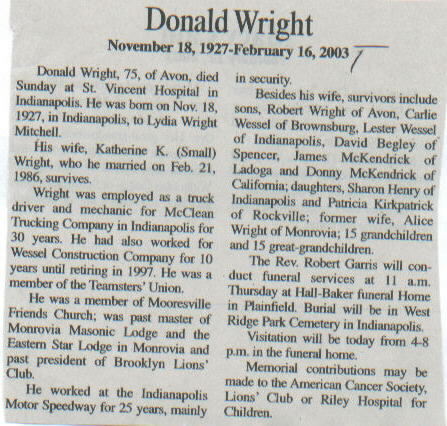 | Survived By | Widow; sons, Robert Wright, Carlie Wessel, Lester Wessel, David Begley, James McKendrick, and Donny McKendrick; daughters, Sharon Henry and Patricia Kirkpatrick; former wife, Alice Wright; 15 grandchildren; 15 great-grandchildren. |