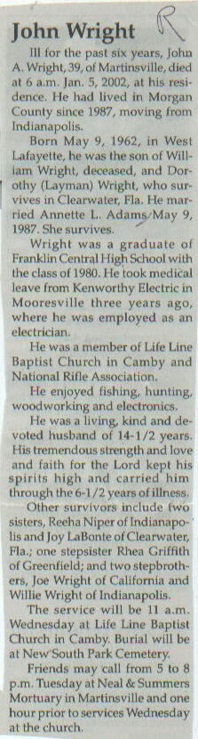 | Survived By | Widow; mother, Dorothy (Layman) Wright; 2 sisters, Reeha Nipr and Joy LaBonte; stepsister, Rhea Griffith; 2 stepbrothers, Joe and Willie Wright. |