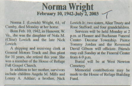 | Survived By | Mother, Nola M. (Cline) Lovich; children, Angela M. Mills and Lenny A. Addair; brother, Nick Lovich, Jr.; 2 sisters, Alice Trusty and Rose Stafford; 4 grandchildren. |
