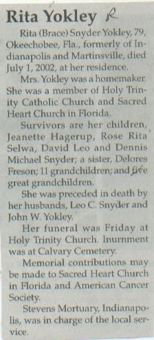 | Survived By | Children, Jeanette Hagerup, Rose Rita Selwa, David Leo, and Dennis Michael Snyder; sister, Delores Freson; 11 grandchildren; 5 great-grandchildren. |
