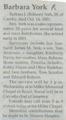 | Survived By | Spouse; son, Tom Andrusk; daughter, Kimberly Davis; mother, Mary Robson; 3 sisters, Pricilla Scholtz, Kathy Hayes, and Olive Radeker; 2 brothers, Tom Scanlon and Edward Robson. |