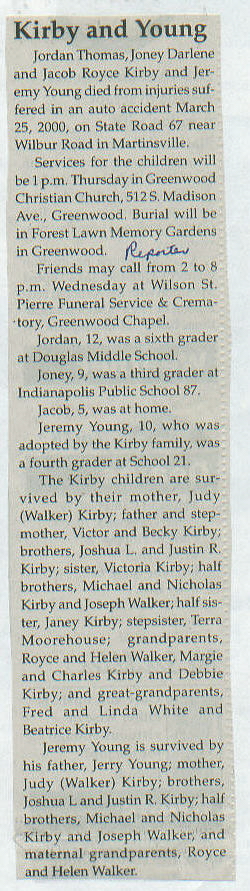| Other | Age 10. He had been adopted by the Judy Kirby family. Died from injuries suffered in an auto accident on State Road 67 near Wilbur Road in Martinsville. Also killed in the crash were: Jordan Thomas, age 12; Joney Darlene Kirby, age 9; and Jacob Royce Kirby, age 5. Jeremy was a fourth grader at School 21. |