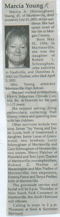 | Survived By | Father, Robert L. Schrougham; 2 sons, James "Jay" Young and Justin Lucas; daughter, Jamie Lucas; 2 brothers, Larry and Gary Schrougham; 2 sisters, Sherri Fletcher and Terri Lynn Thacker; 2 stepbrothers, Richard G. and Max Prather; 2 stepsisters, Dorena Pierce and Tanya Prather. |