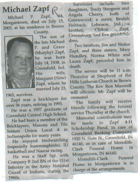 Survived By Widow; 2 daughters, Trudy Sturgeon and Angela Cherry; sister, Beulah Fishback; brother, Clifton Zapf; 5 grandchildren.