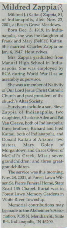 | Survived By | Spouse; son, Steve Zappia; 2 daughters, Charlene Allen and Pat Van Cleave; 3 brothers, Richard, Fred, and Donald Kattau; 2 sisters, Mary Ooley and Grace Oliver; 7 grandchildren; 3 great-grandchildren. |