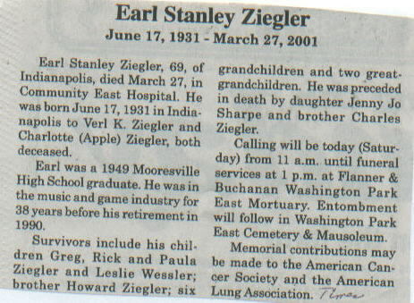 | Other | He was born in Indianapolis to Verl K. Ziegler and Charlotte (Apple) Ziegler, both deceased. He was preceded in death by daughter Jenny Jo Sharpe, and brother Charles Ziegler. |