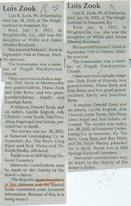 | Survived By | Spouse; stepson, Dale Zook; 2 grandchildren, Diana Zook and Julie Barto; 2 great-grandchildren, Emily and Jonathan Barto. |